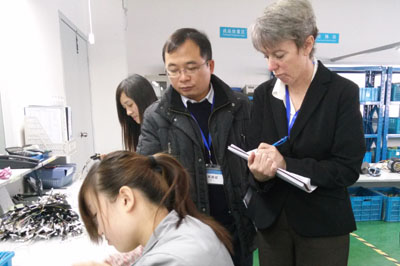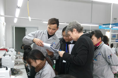 在品質部經理胡俊的陪同下,客戶參觀了各生產車間、倉儲現場、辦公區域等。胡經理認真地向客戶介紹產品實現的每一道工序,并讓客戶親自動手檢驗。對關鍵過程尤為仔細,查閱作業指導書、過程檢驗記錄等??蛻粢卜浅UJ真地向我們了解各種產品的性能和用途,不停的記錄,并連聲稱贊“Very Good!”。