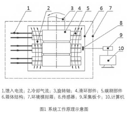 工況模擬系統在各線路的適當位置處設置了電氣保護裝置和警示裝置以保證人員安全。該系統結構簡單、工作可靠、振動小、噪聲低、通用性好,能夠模擬滑環轉速在0-2000RPM之間、饋入電流在0-100A之間、溫度和濕度等物理量變化在所允許范圍之內的任意工況。