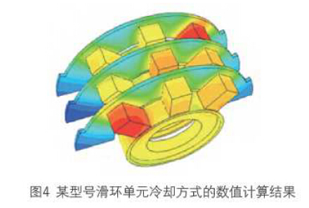 同時,對該型號電滑環采用數值計算的方法進行分析,之后可以將計算結果與測試結果進行比對,通過這種計算與實驗相結合的方法來分析其冷卻系統的性能。溫度分布的數值計算結果如圖4所示。